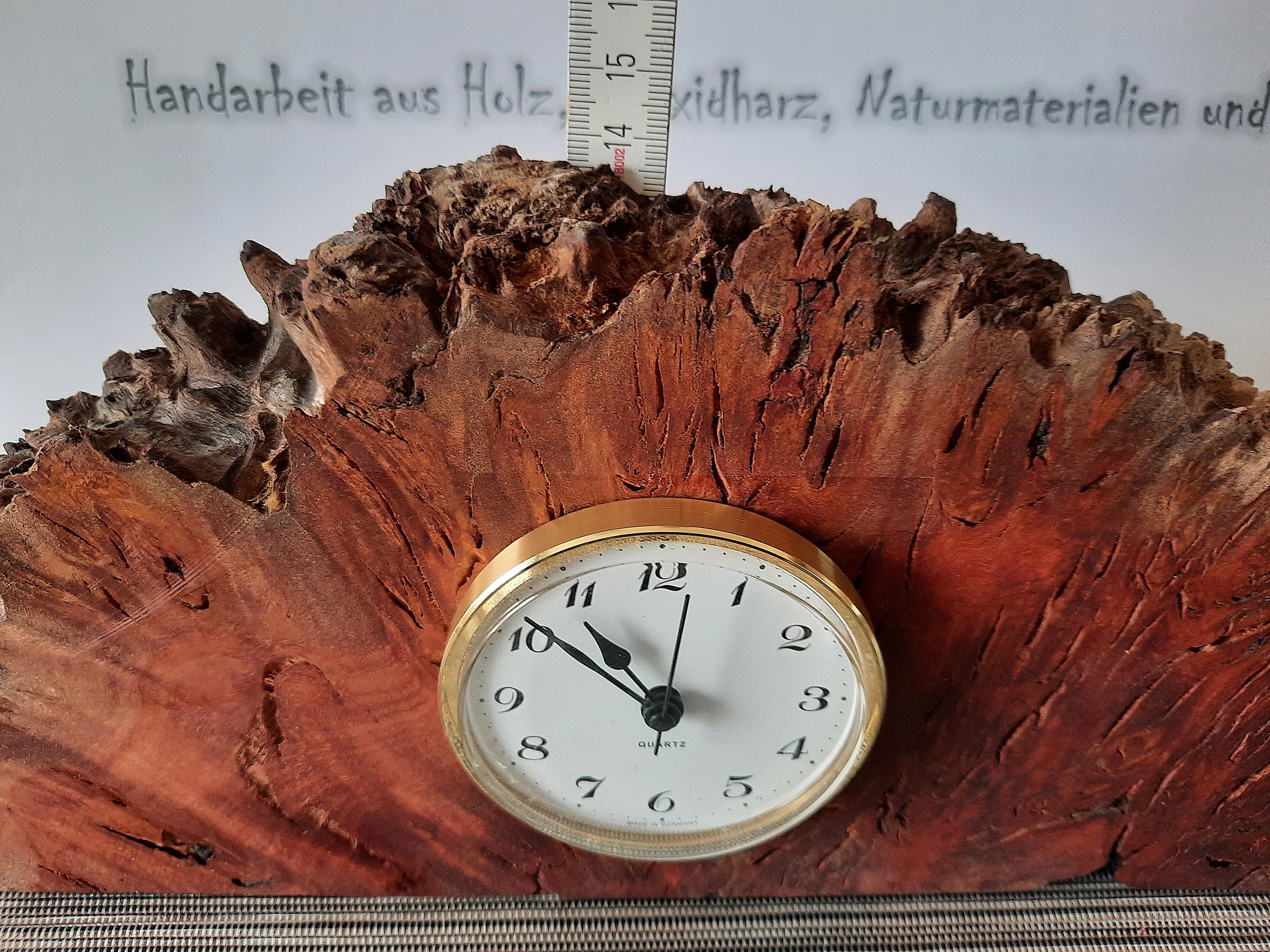 Mantel clock/table clock made of fine wood - a handcrafted, unique piece ideal for decoration in hallways, offices, living rooms, and dining rooms. Decorative fine wood with a battery-operated clock movement; the movement (approx. 70 mm) can be easily removed and the battery replaced.
