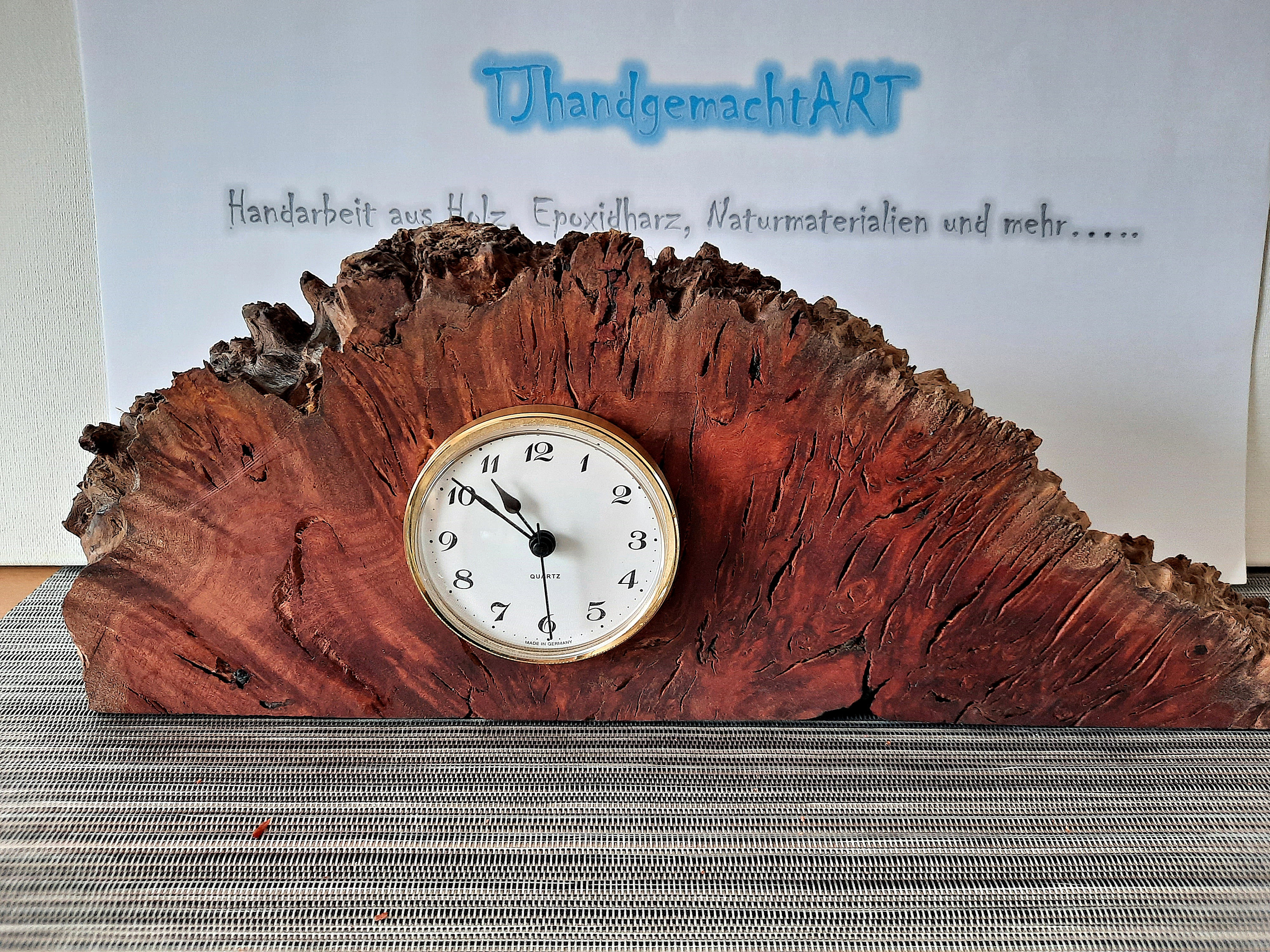 Mantel clock/table clock made of fine wood - a handcrafted, unique piece, sanded, drilled, and treated with wood oil. Please note: Wood is a natural product and may change over time (cracks, etc.) and the color may fade. This can then be re-oiled as desired.