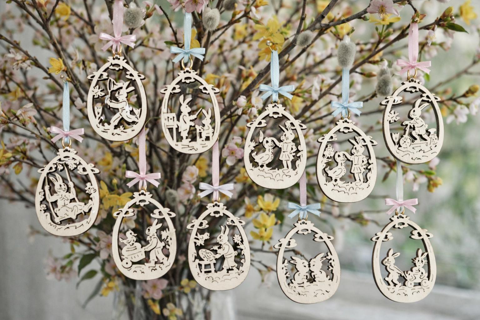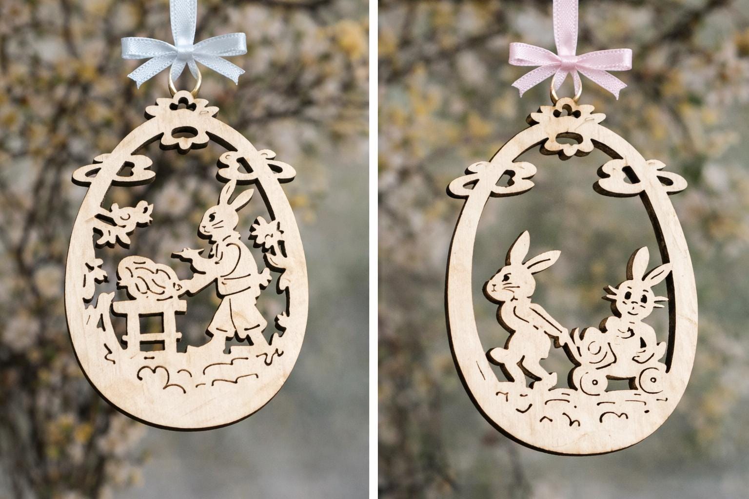11x Wooden Easter Decorations - Egg-Shaped Eggs with Rabbit Motifs - Hanging Decorations, Easter Bouquet (approx. 6 cm) for Celebrations, Gifts, Easter