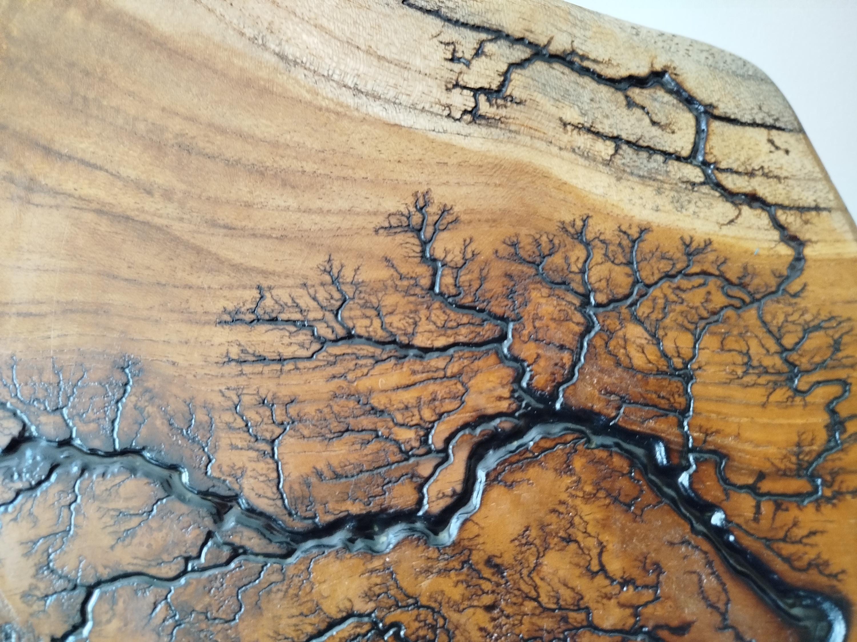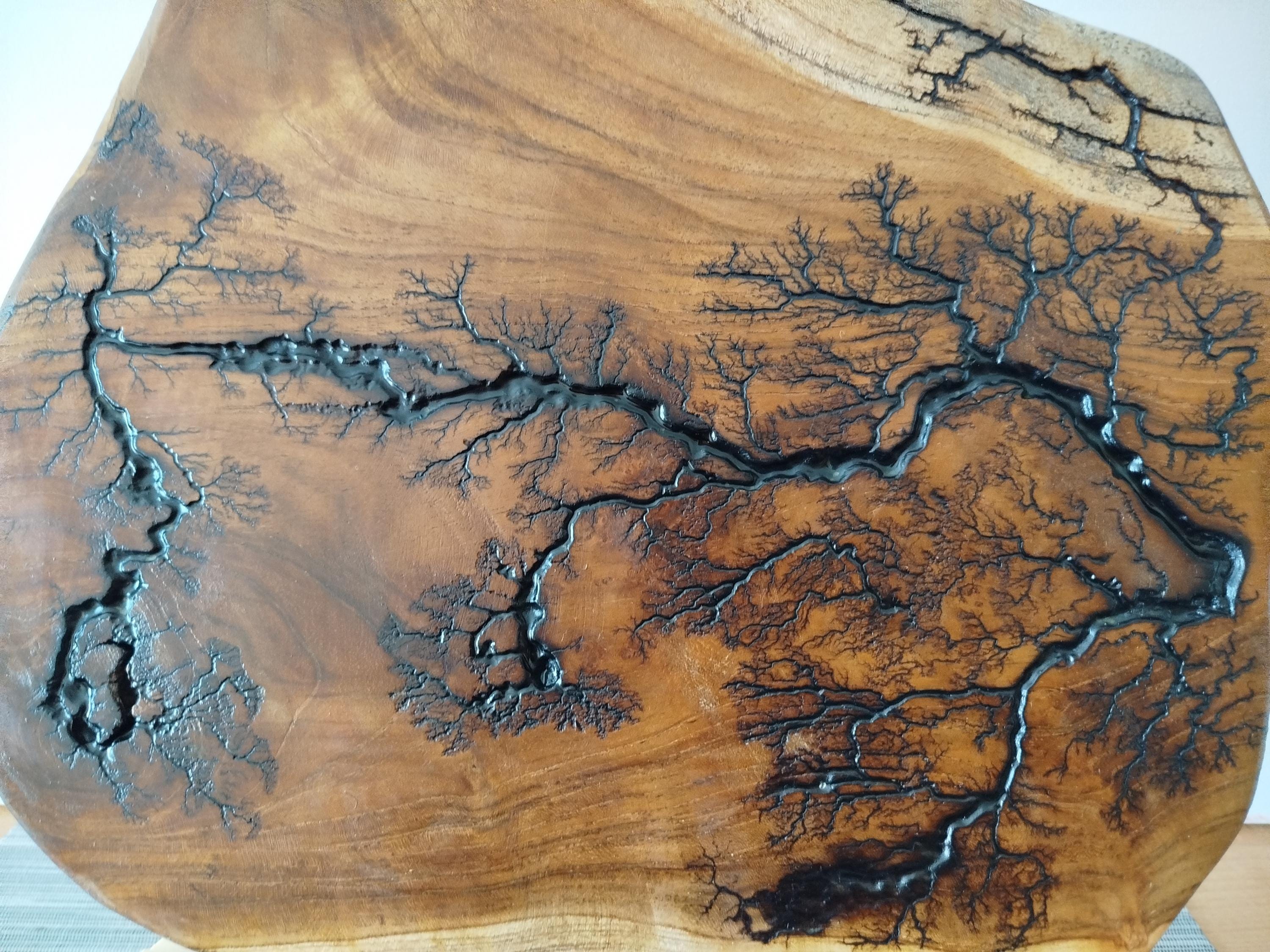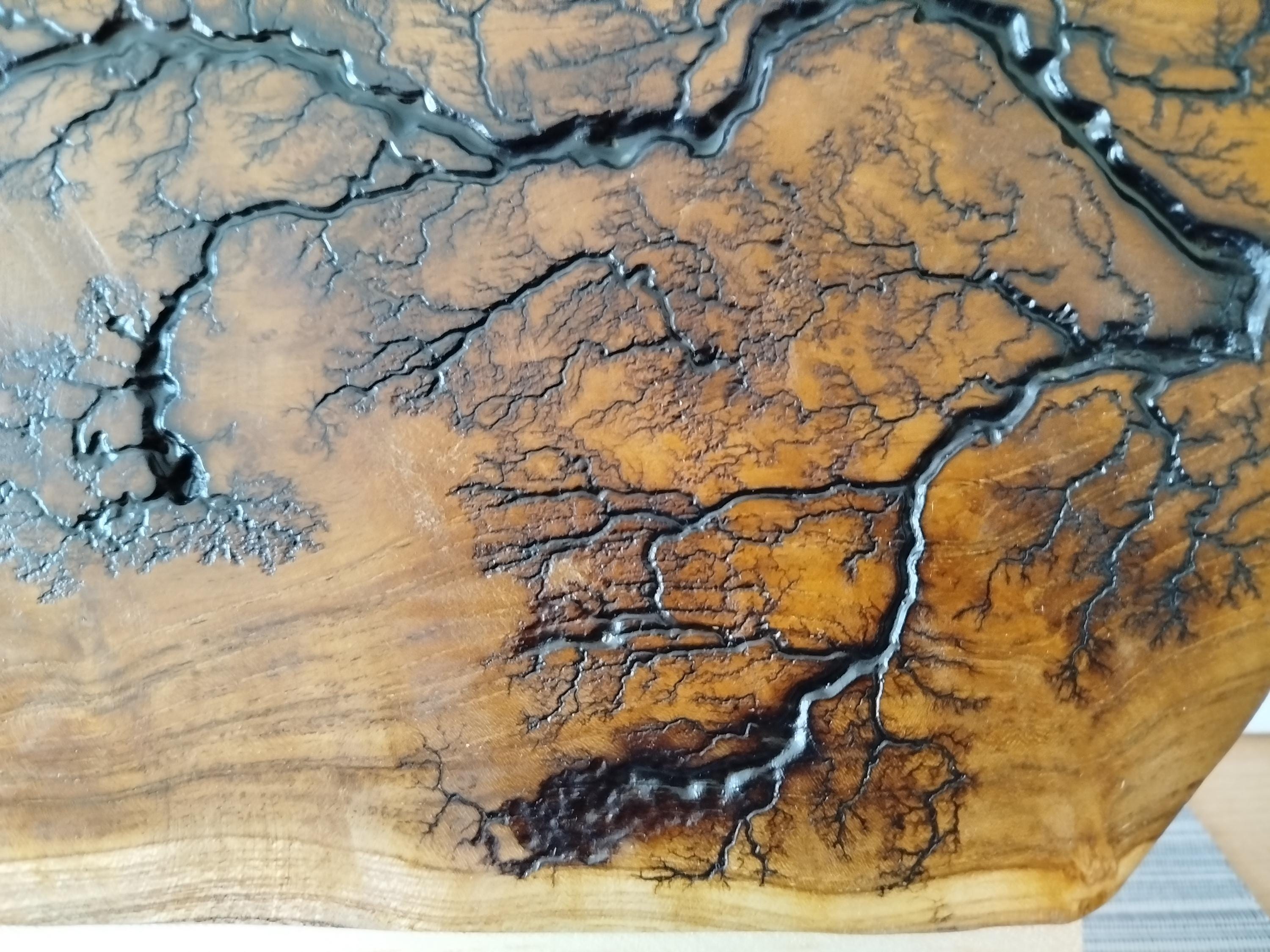 In the Lichtenberg process, pieces of wood are processed with high-voltage current and a pattern is burned into the wood. The structure of these figures is always purely random and cannot be influenced. Very beautiful tree/branch structures are created. These structures can then be finished with epoxy resin or acrylic paint.