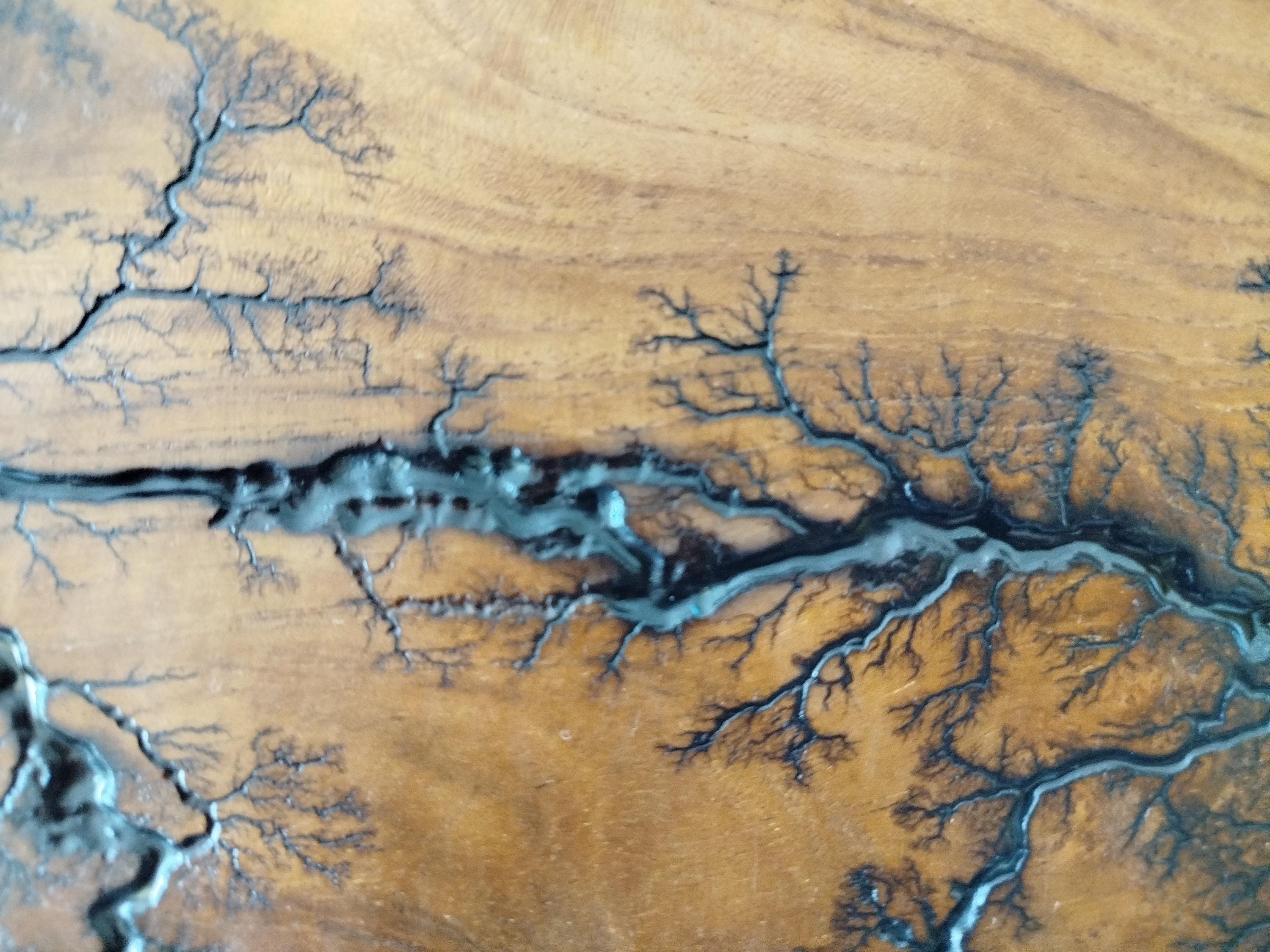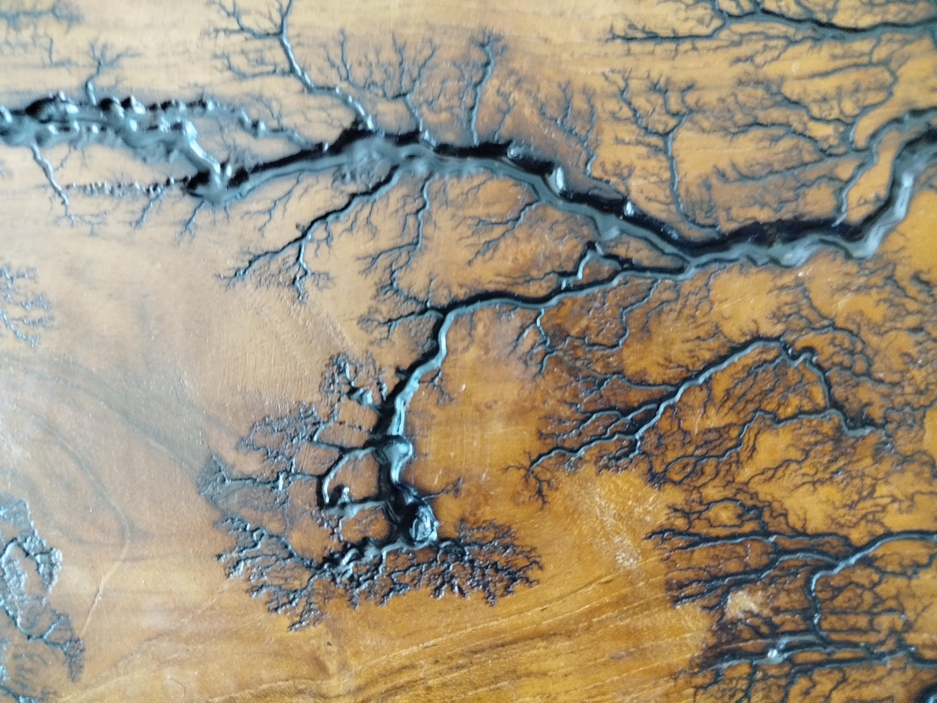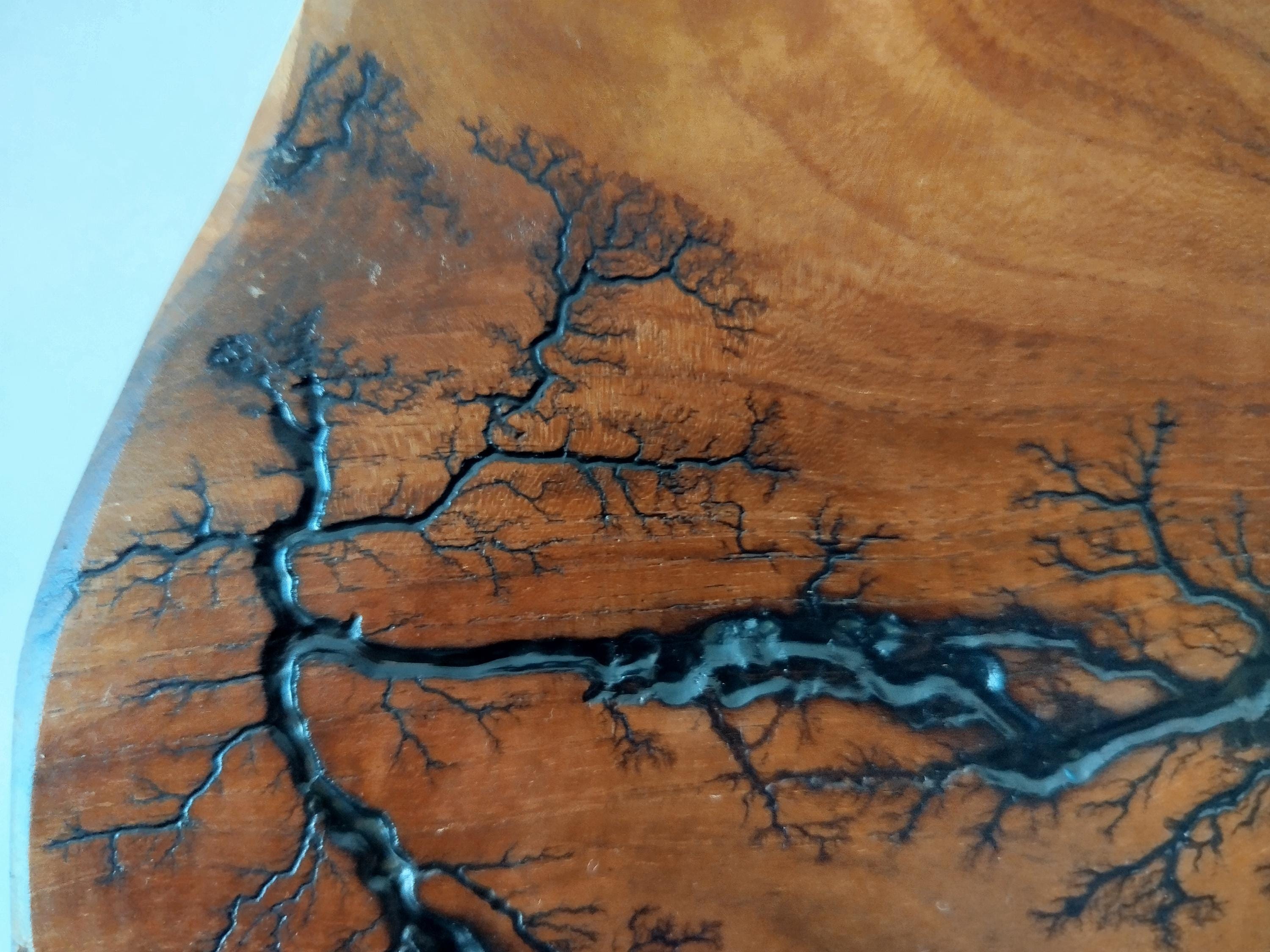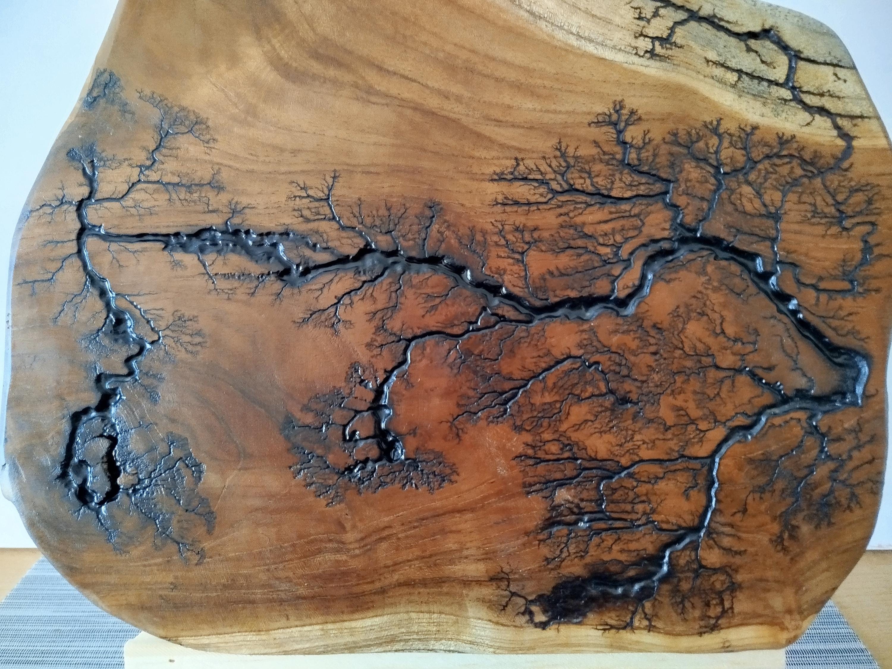 In the Lichtenberg process, pieces of wood are processed with high-voltage current and a pattern is burned into the wood. The structure of these figures is always purely random and cannot be influenced. Very beautiful tree/branch structures are created. These structures can then be finished with epoxy resin or acrylic paint.