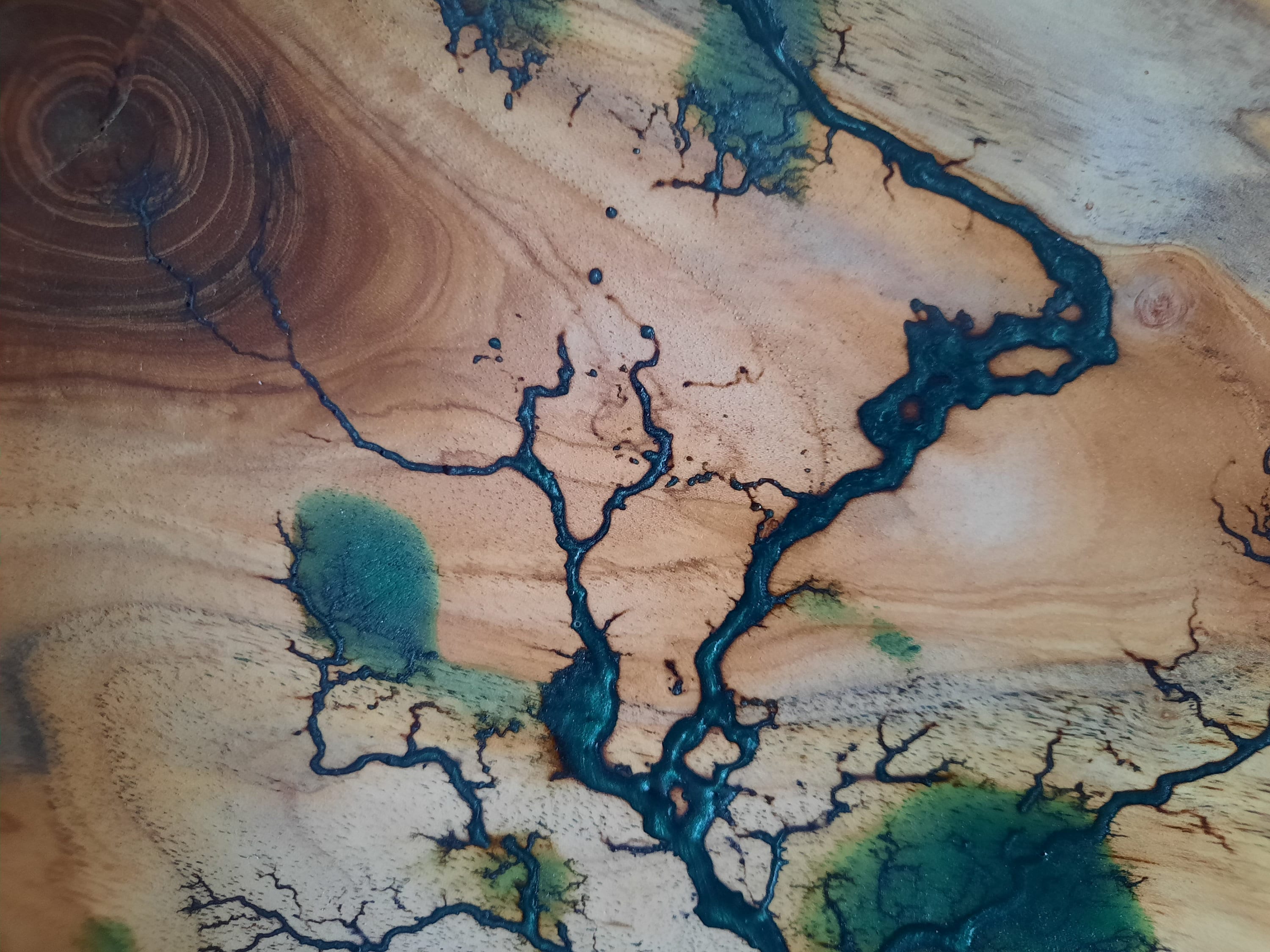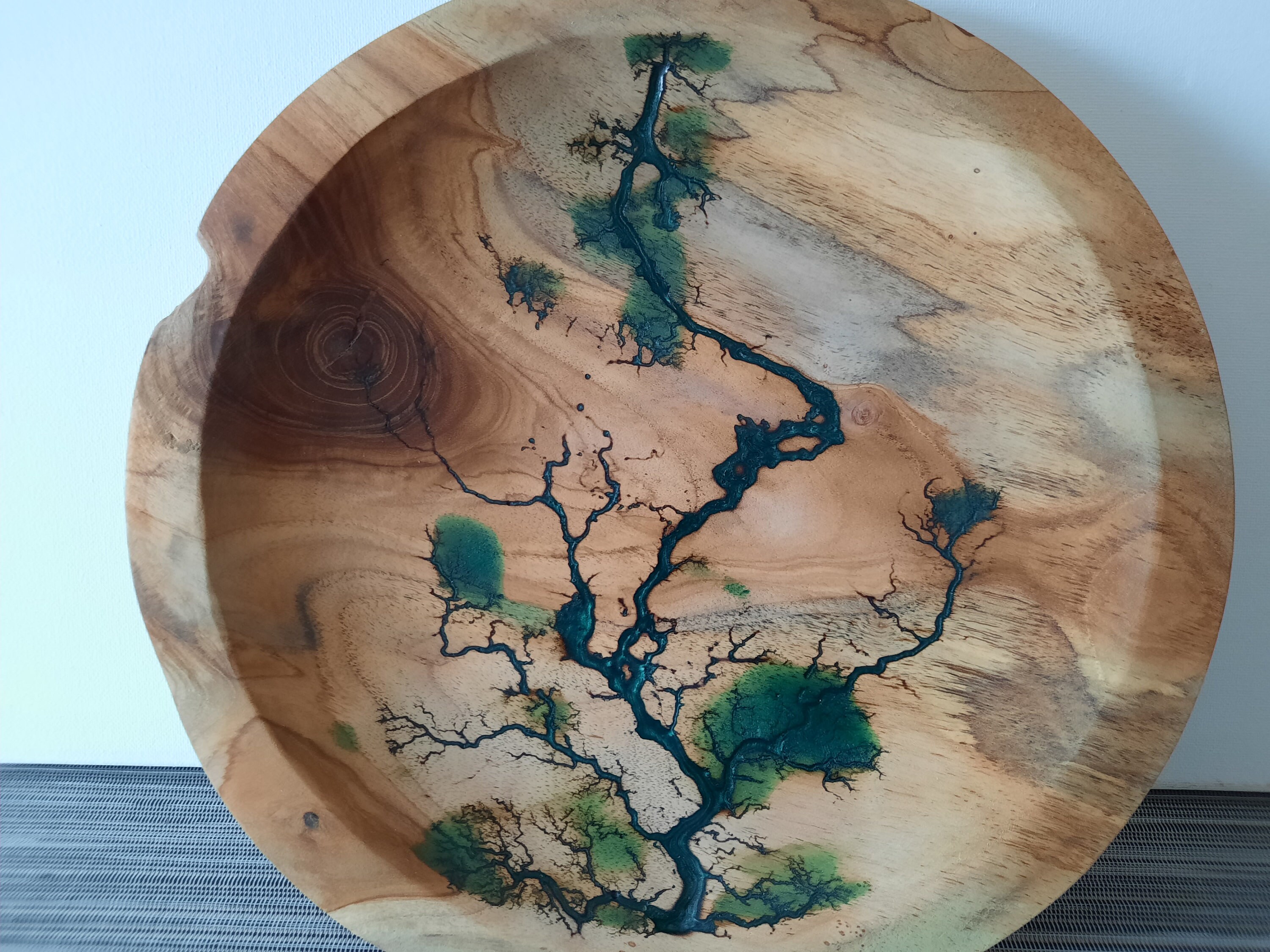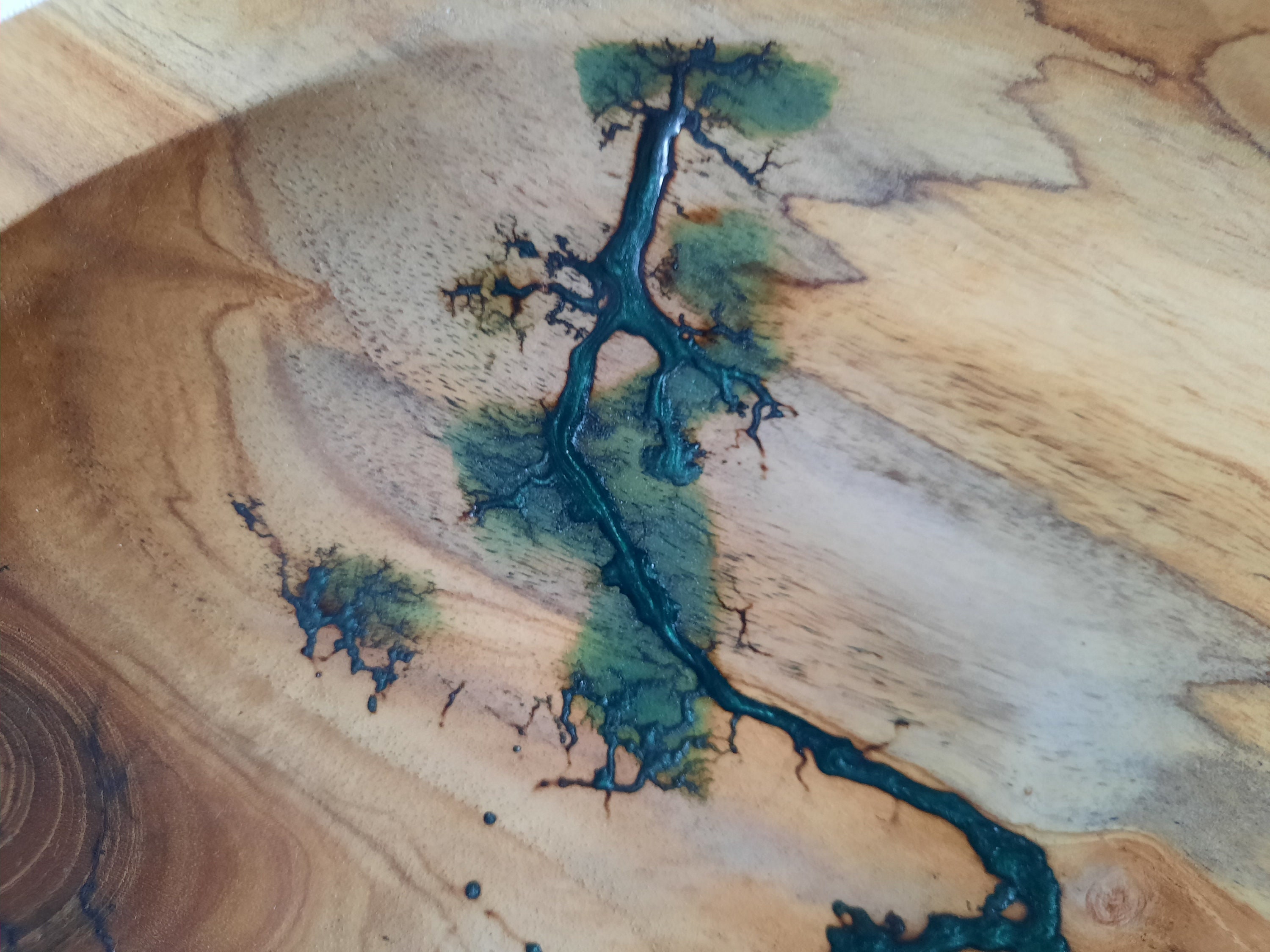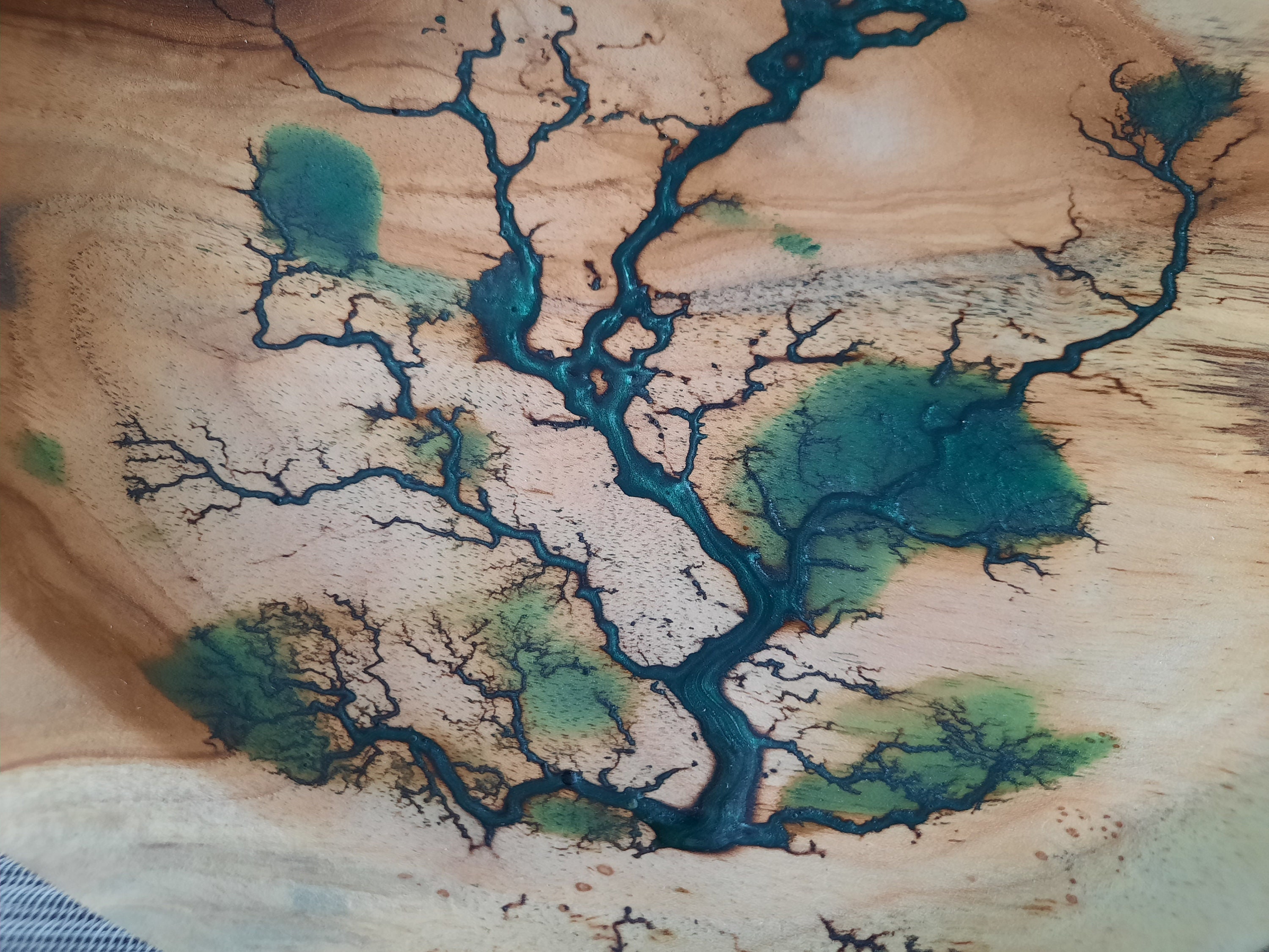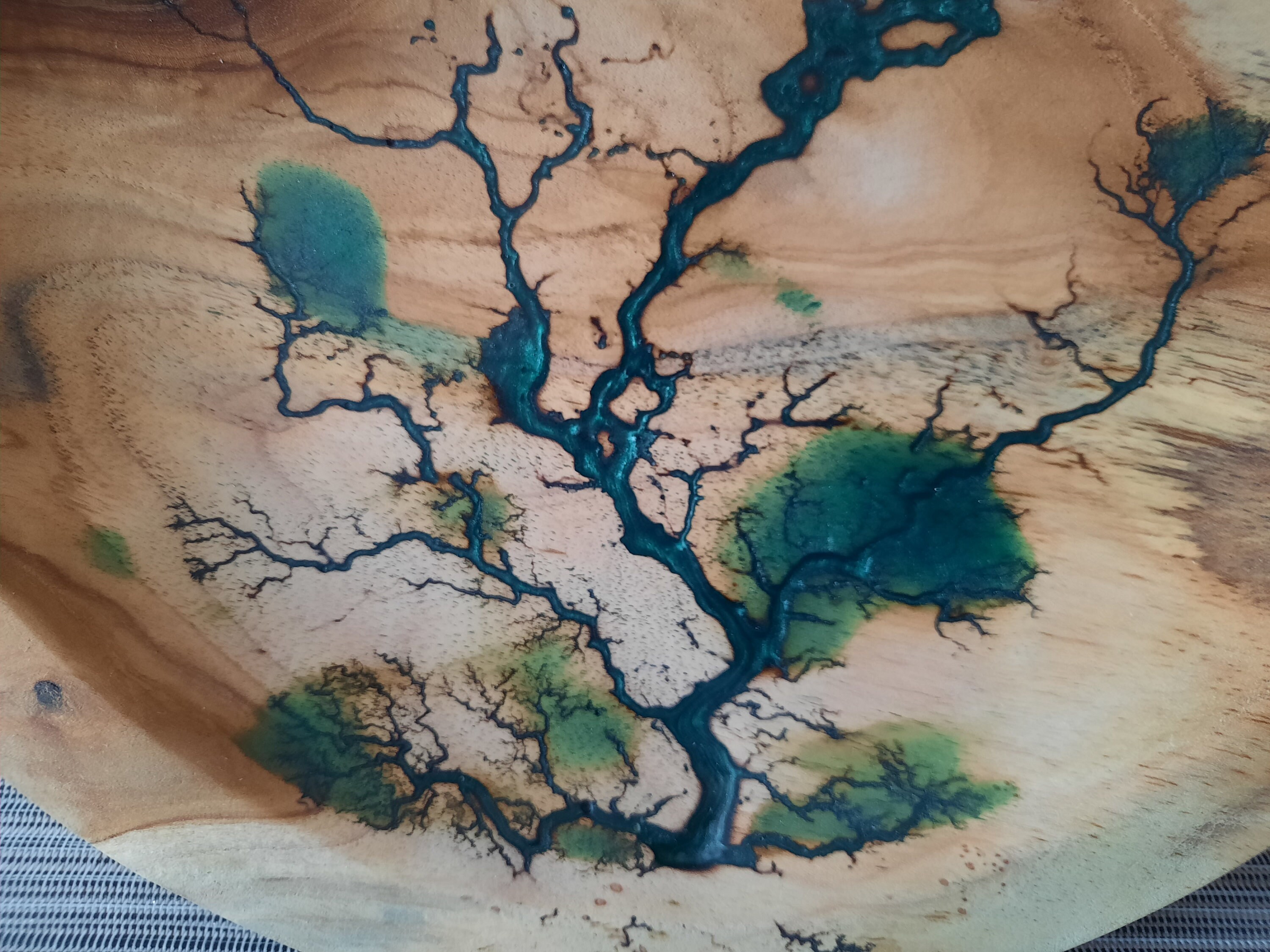 Lichtenberg figures, burned wood-Lichtenberg figures,burned wood/DECORATIVE bowl diameter approx. 26 cm. Epoxy resin metallic green/The bowl was sealed with food-safe oil/UNIQUE, handmade