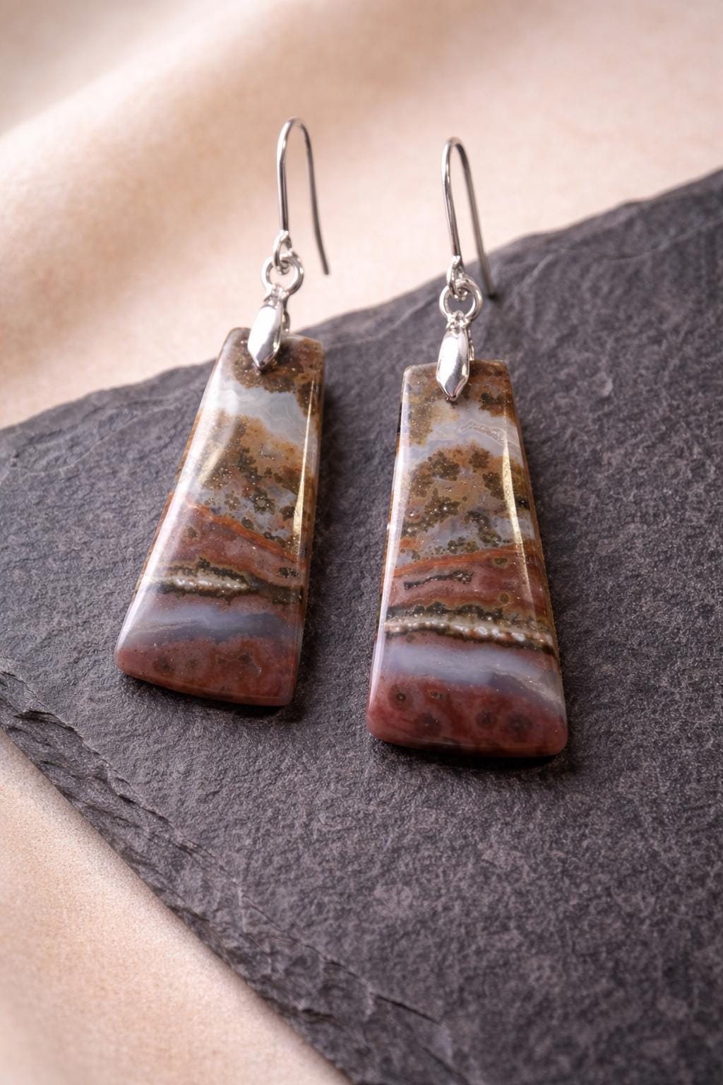 The earrings consist of a cabochon-cut semi-precious stone – the underside is flat and the top is semi-circular, polished, and drilled. A pendant loop made of 925 sterling silver and a closed ear hook, also made of 925 sterling silver, are set into these holes. A handcrafted, unique piece.