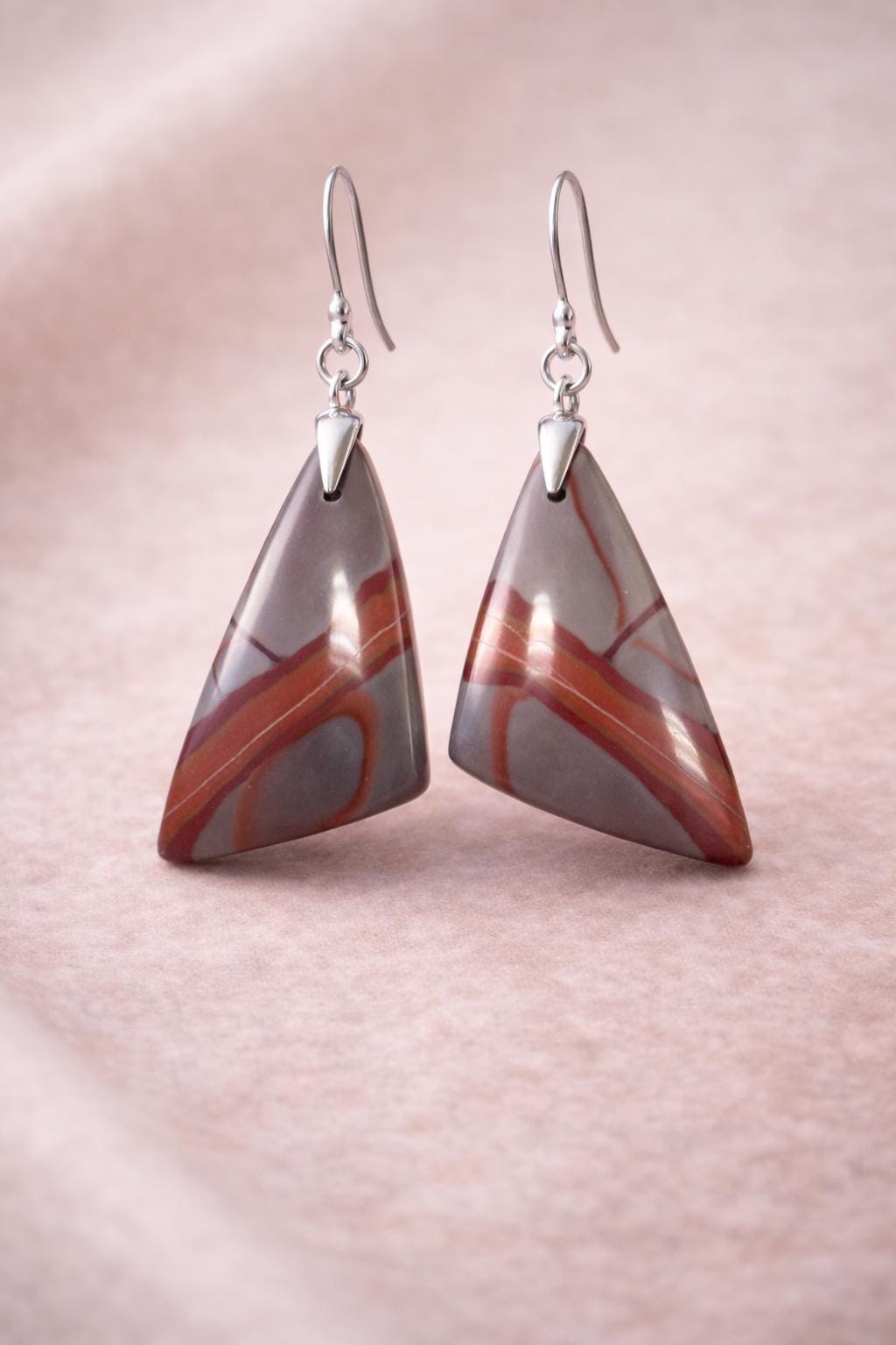 The earrings consist of a cabochon-cut semi-precious stone – the underside is flat and the top is semi-circular, polished, and drilled. A pendant loop made of 925 sterling silver and a closed ear hook, also made of 925 sterling silver, are set into these holes. A handcrafted, unique piece.