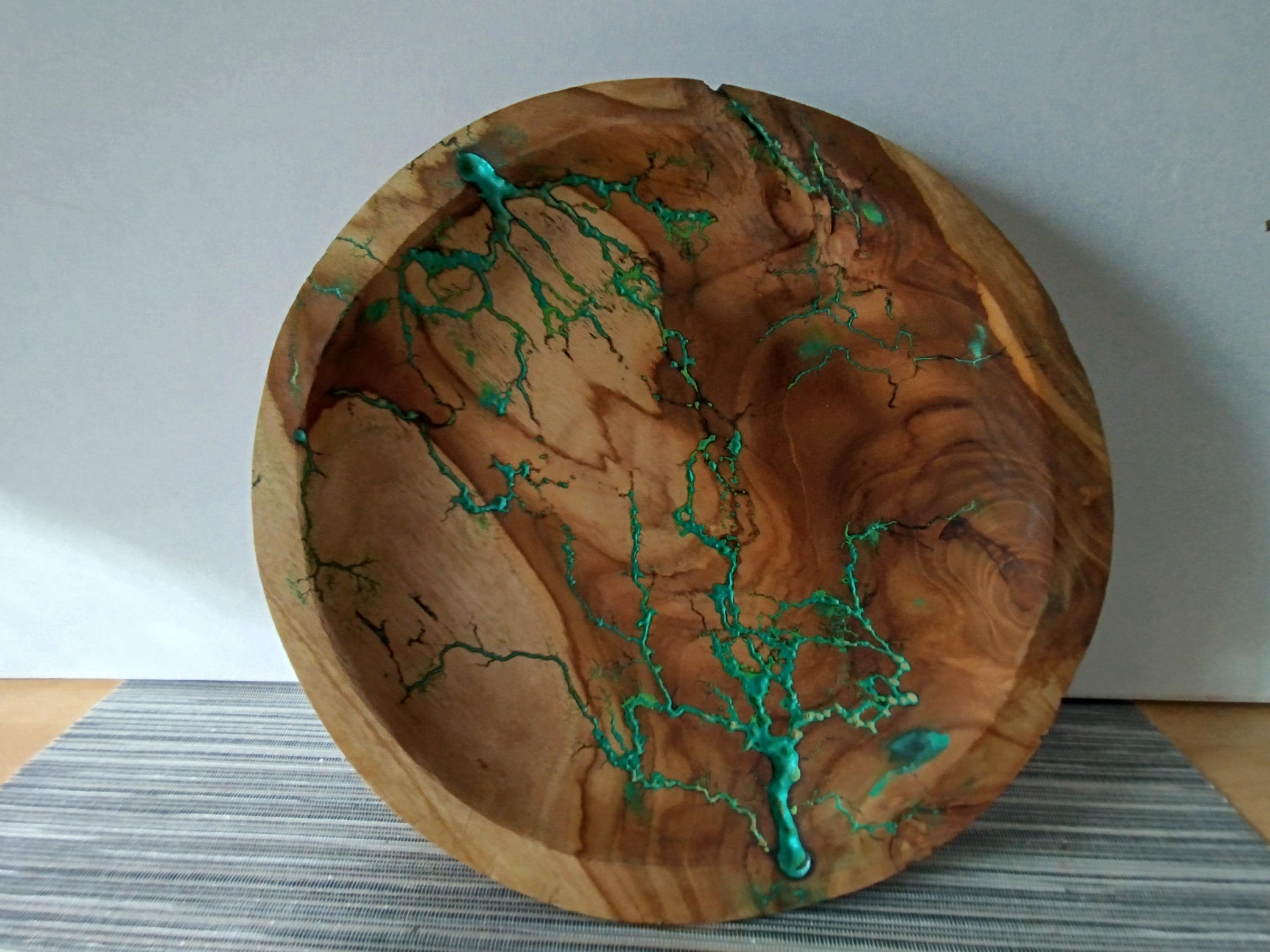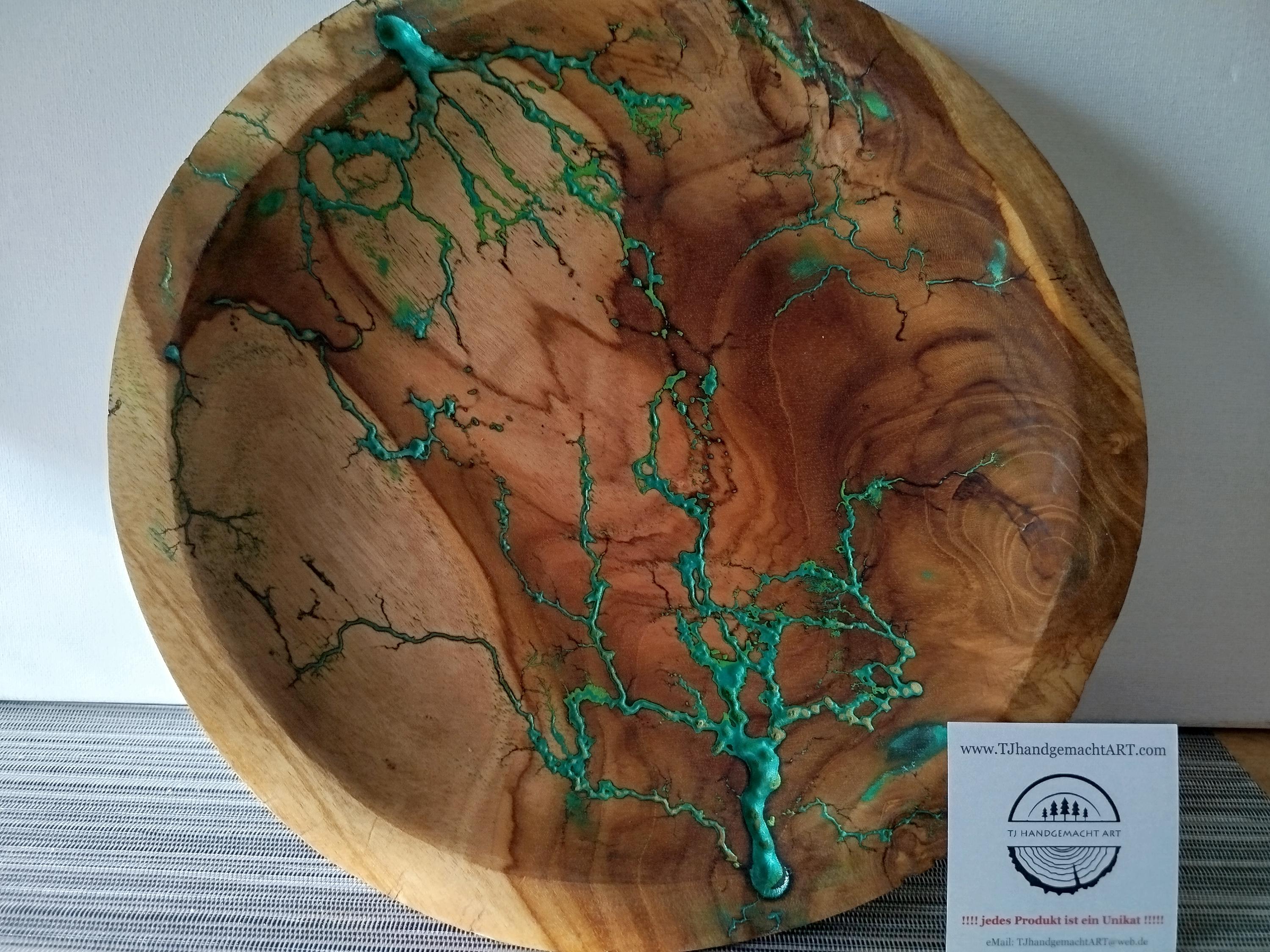 Lichtenberg figures, burned wood-Lichtenberg figures,burned wood/DECORATIVE bowl/fruit bowl diameter approx. 26 cm. Acrylic paint metallic green/The bowl was sealed with food-safe oil/UNIQUE, handmade