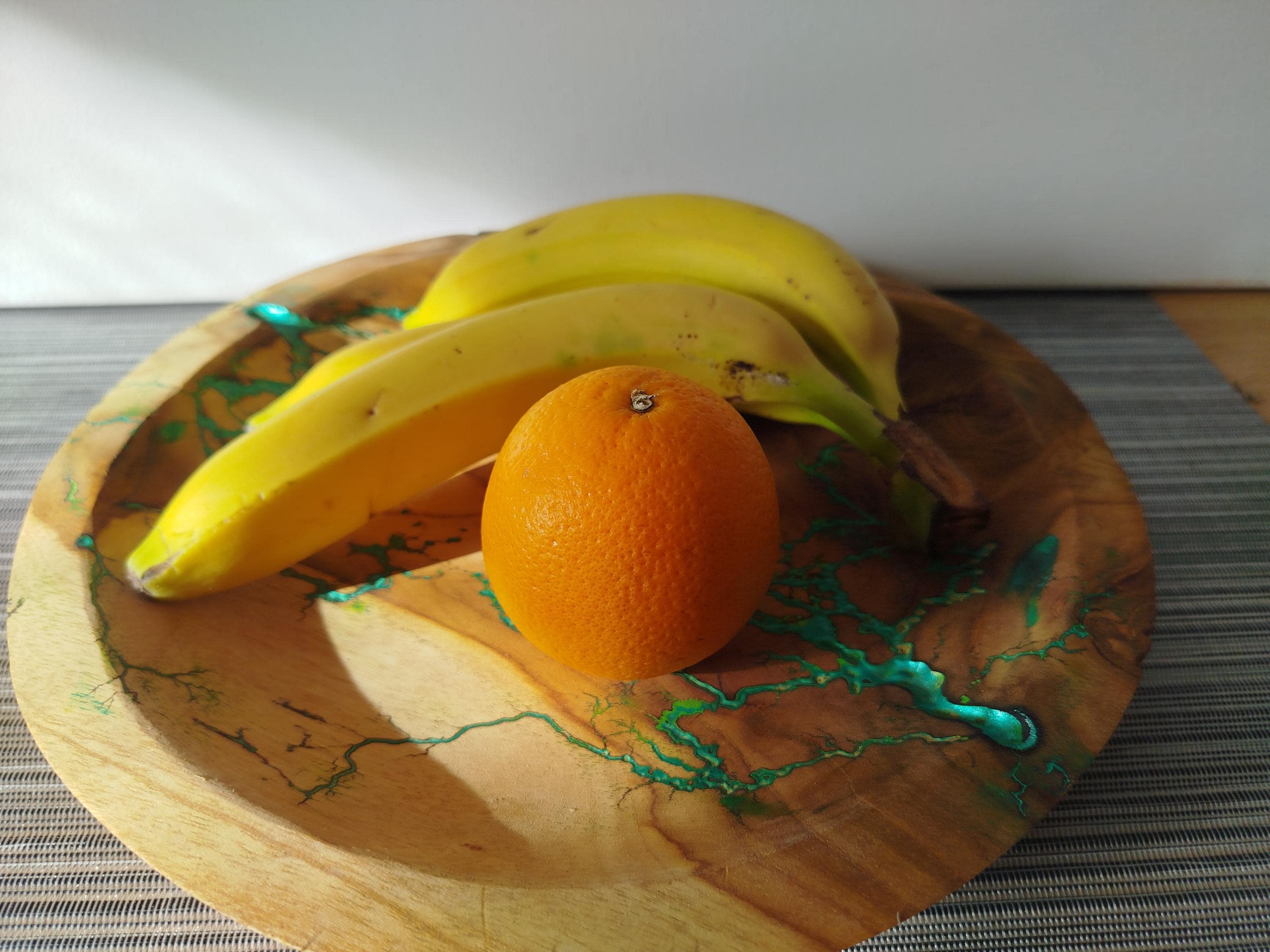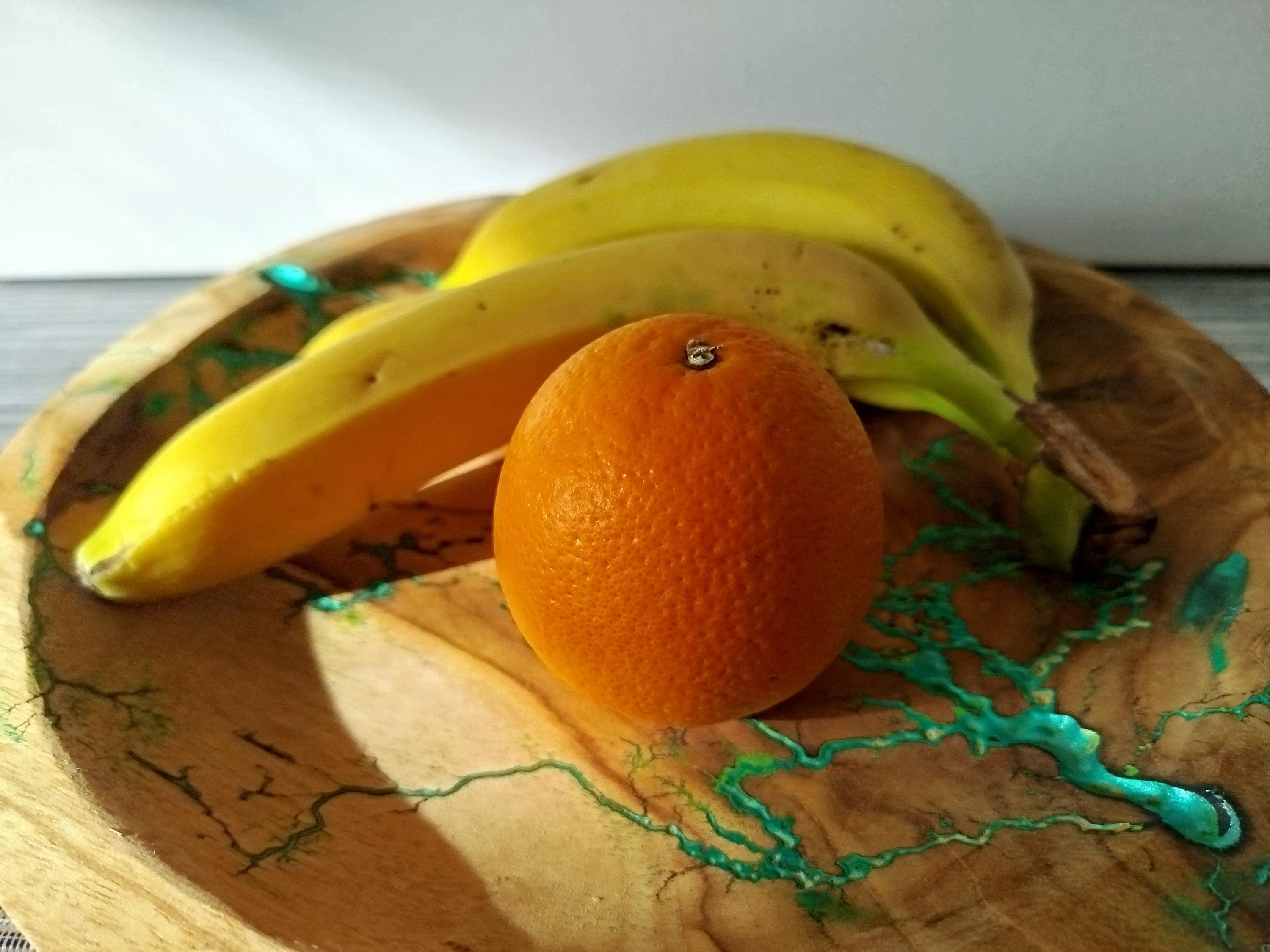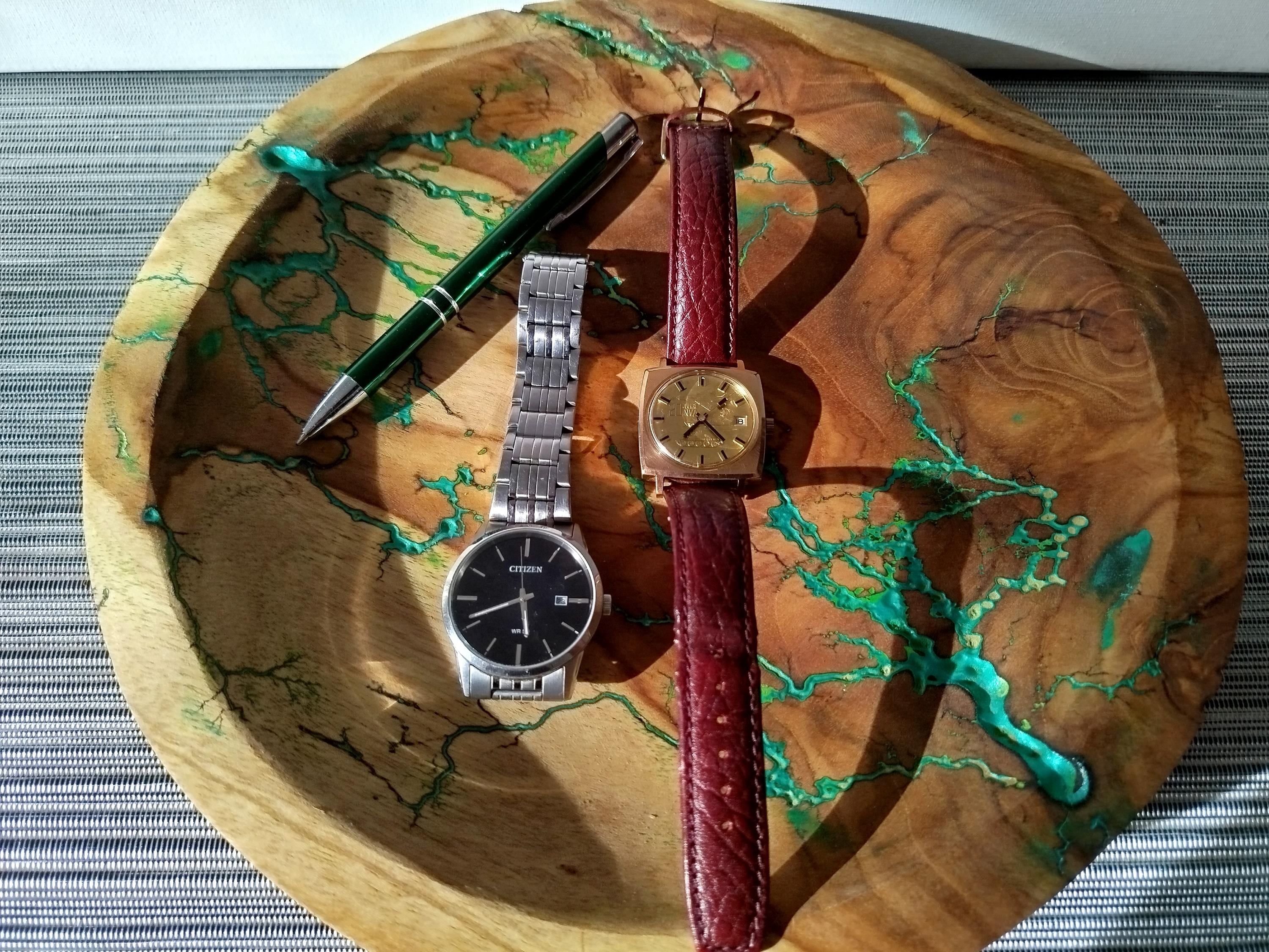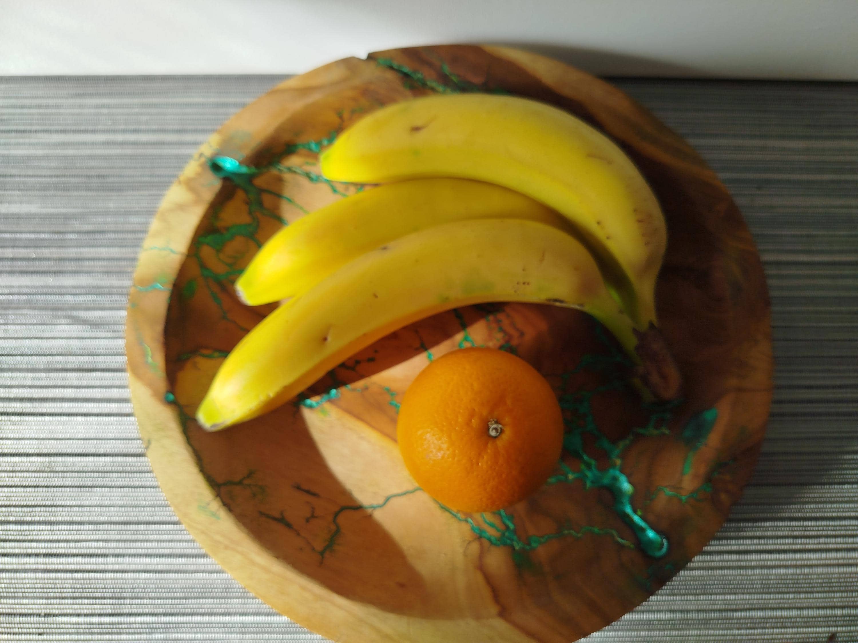 The decorative bowl offered is made of wood and has been filled with epoxy resin and green metallic powder, sanded and sealed with food-safe oil.