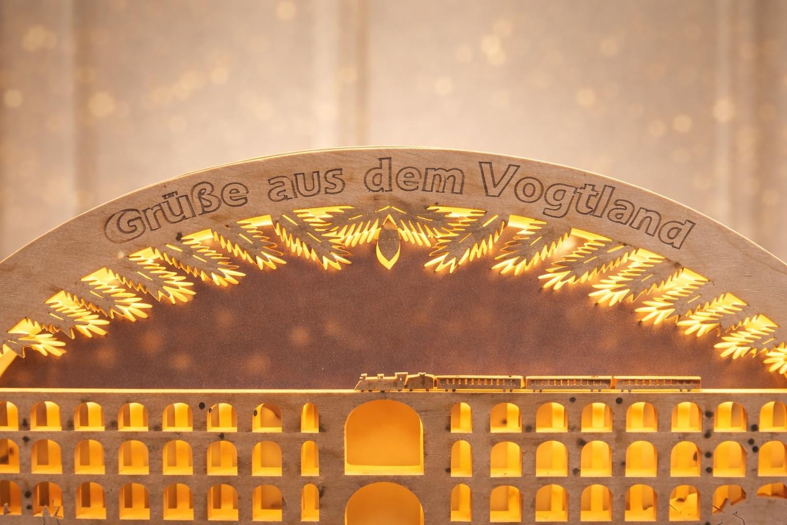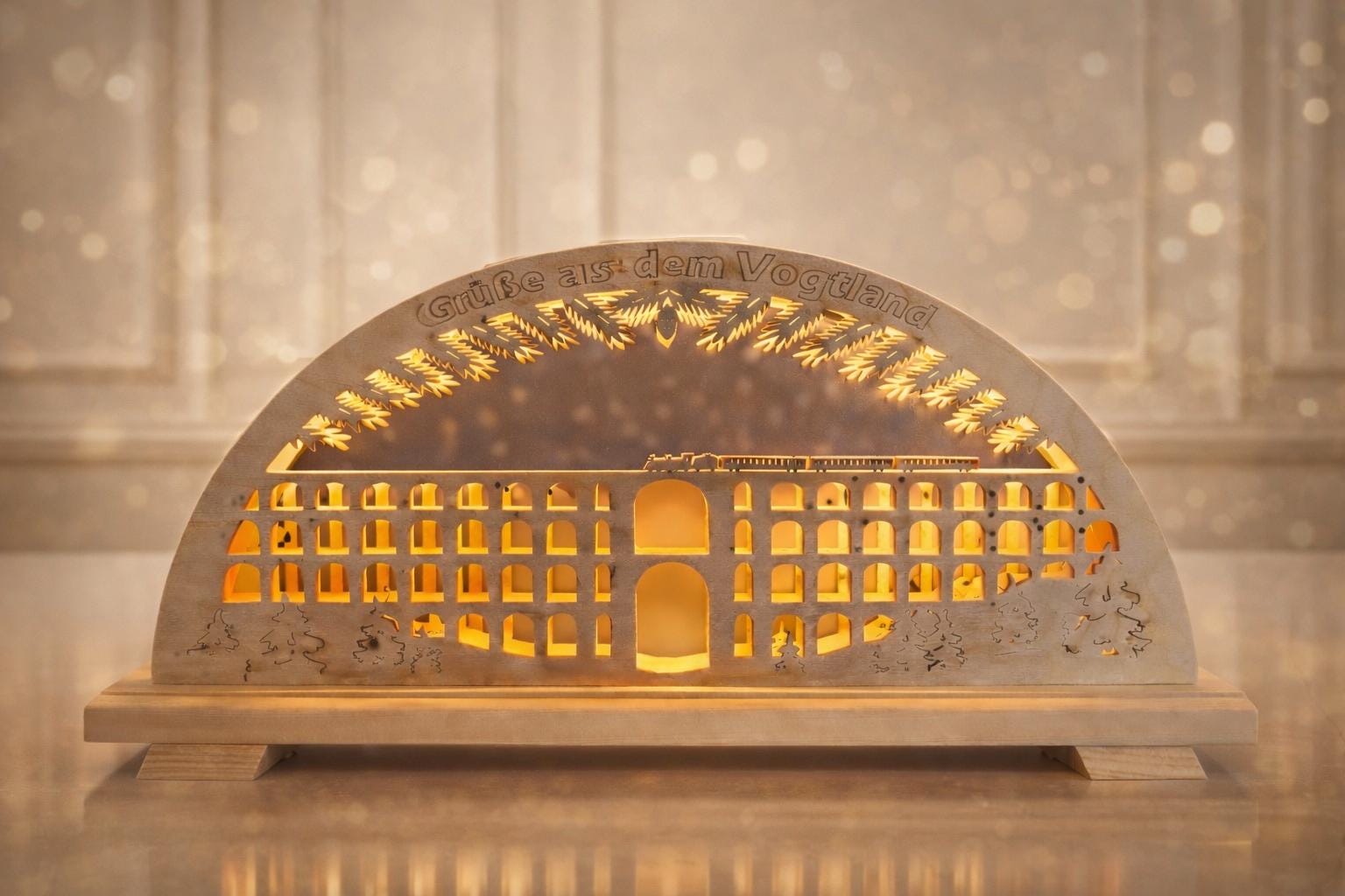 Göltzschtal Bridge Vogtland (large) Schwibbogen motif Göltzschtal Bridge/New / 52 x 26 cm high quality - produced in Saxony/Vogtland - in 3D optics - illuminated with LED strip Limited edition (5 pieces) The figures are glued on.