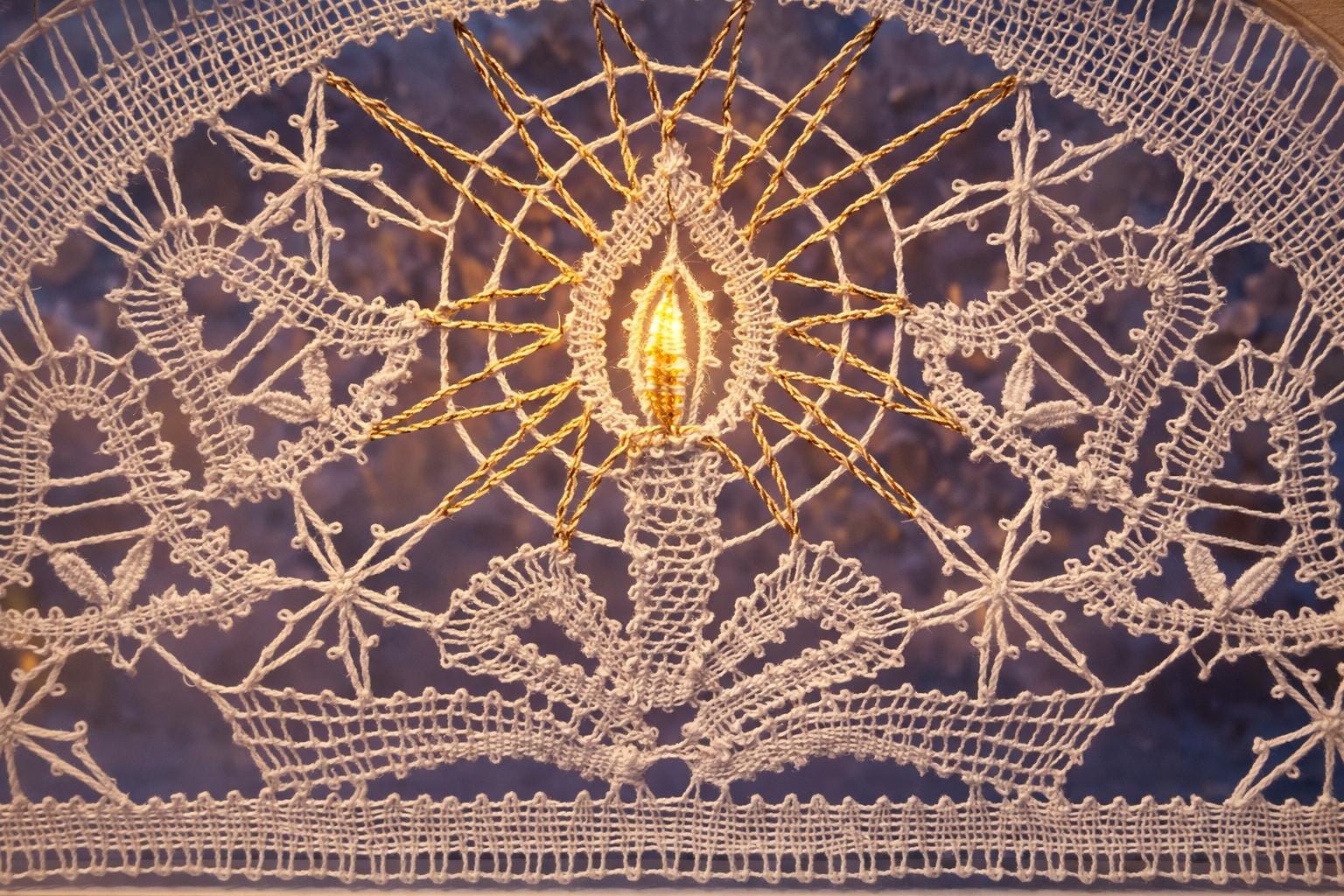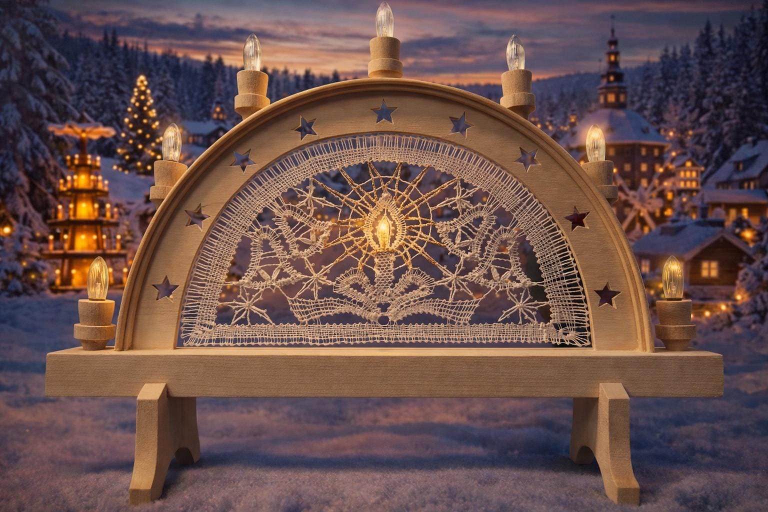 A different kind of candle arch/candle arch - Erzgebirge candle arch made of wood with 7 electric candles, cable with switch and a bobbin lace inlay.