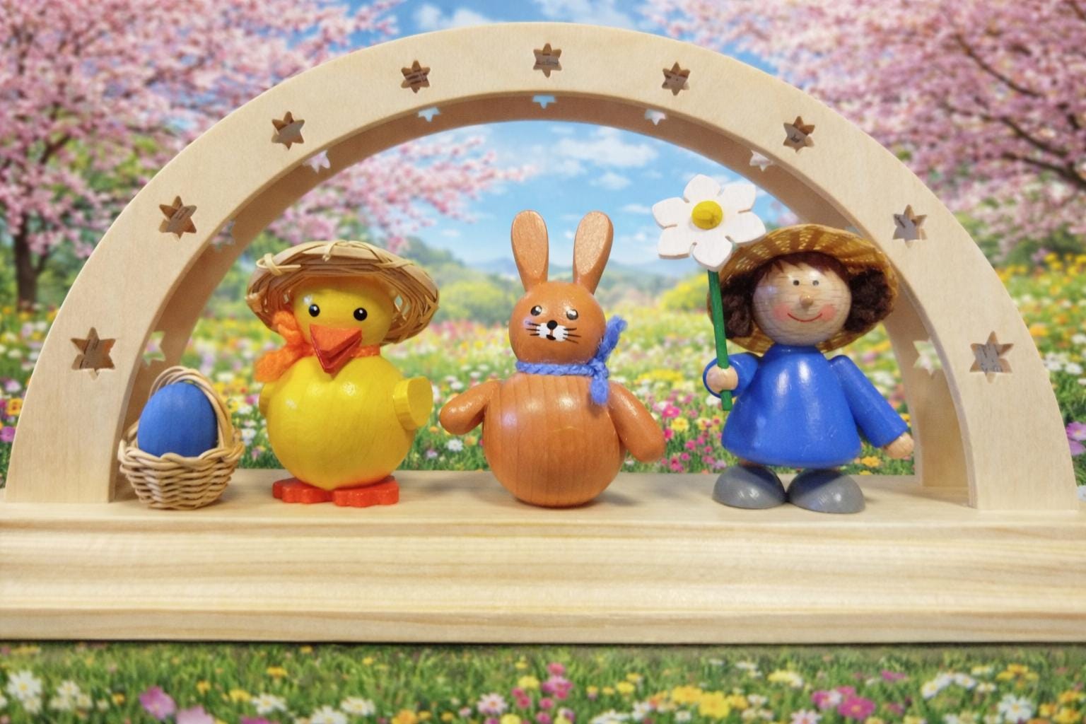 Figures: Flower girl, rabbit, duck, basket with egg/Figures are glued on.